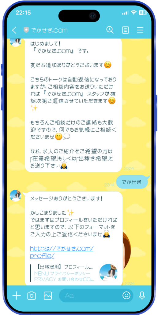 求人紹介を希望される方は、挨拶メッセージの後にお送りさせて頂くプロフィールフォーマットをご記入ください。内容を確認後、12時間以内に『でかせぎ.com』の求人担当より改めてご連絡をさせていただきます。