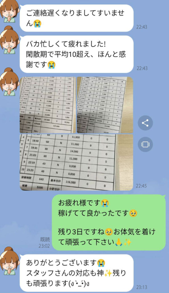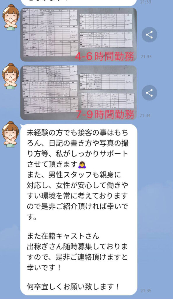 確定後はお店の担当者様のご連絡先を記載の店舗情報・流れに関してのご連絡をお送りさせて頂きます。出稼ぎ希望であれば挨拶ご連絡・在籍希望であれば体入日時のご予約を済ませましょう。